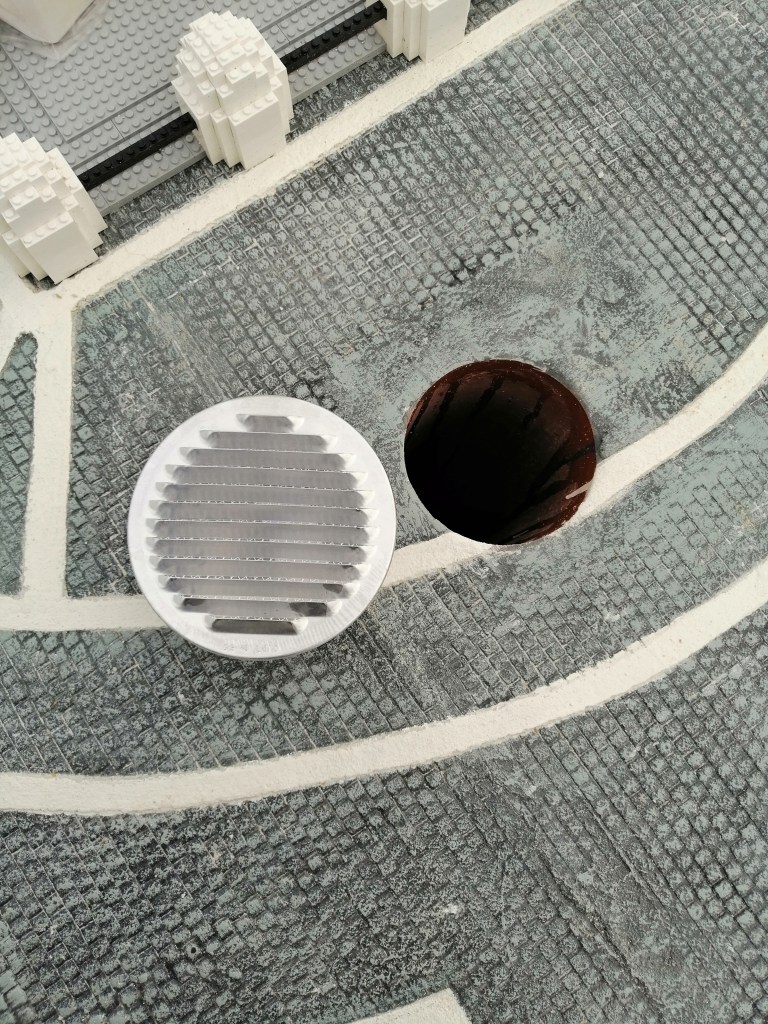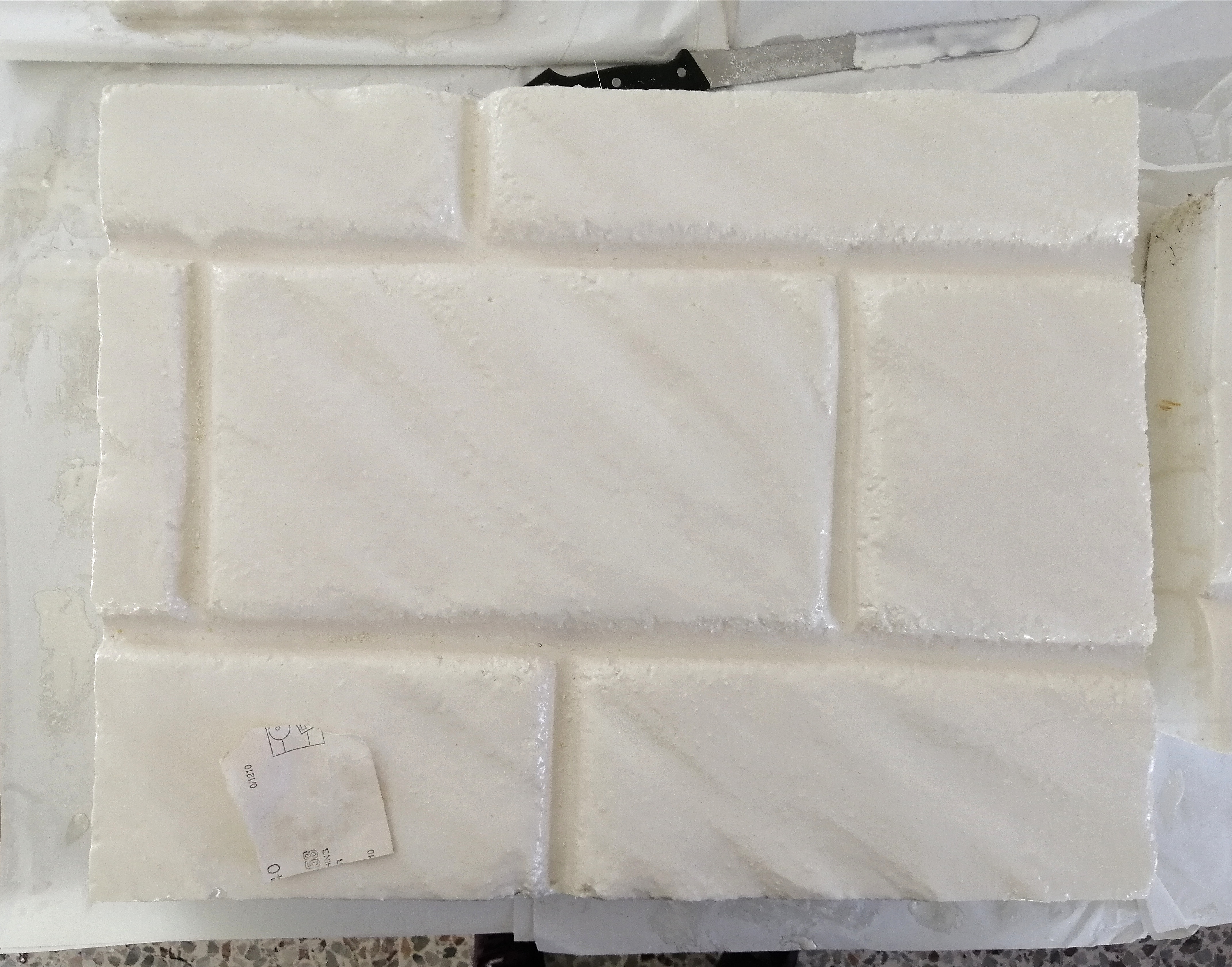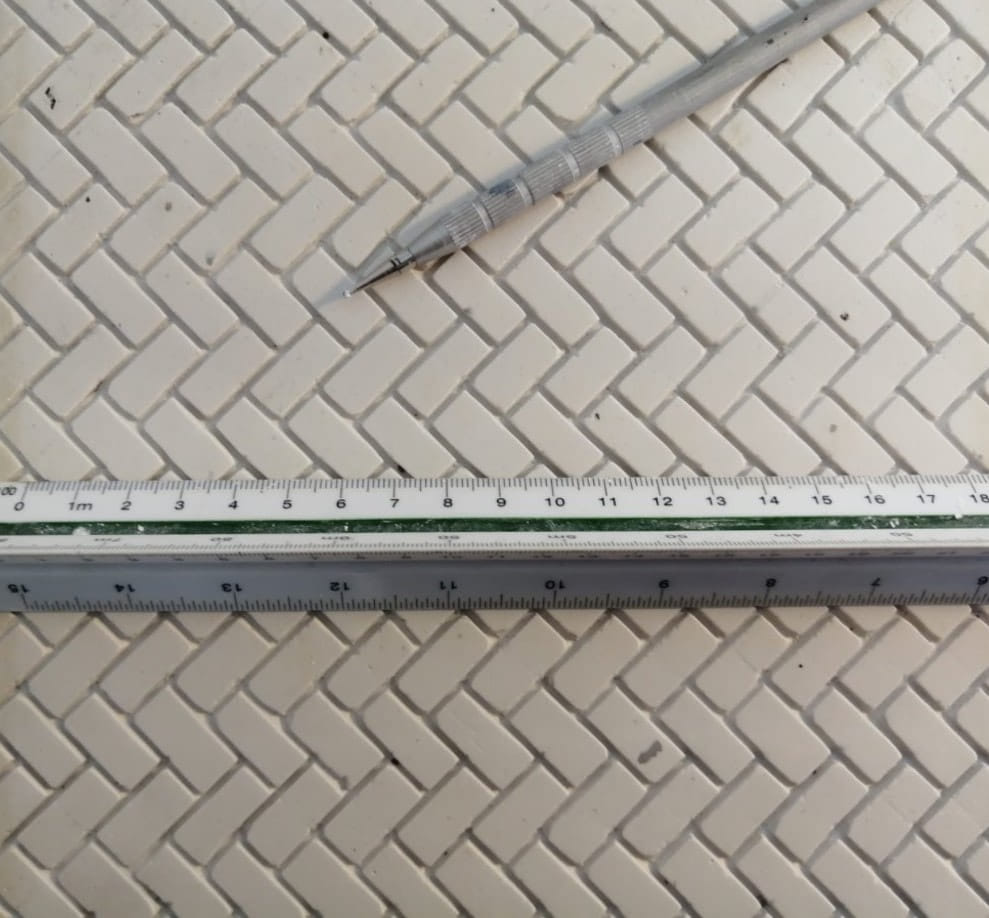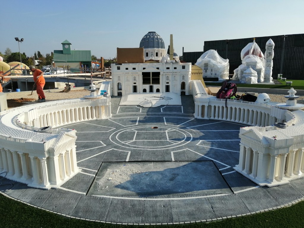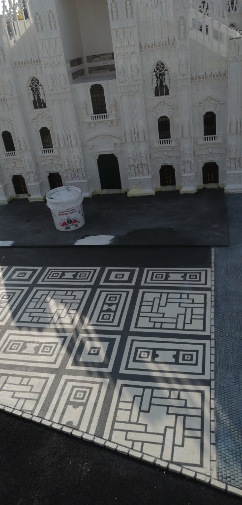 Prototipo negativo per creazione stampo, campione e realizzazione finale: pavimento stampato in miniatura, effetto pietra grigia, 2020-21 per Miniland Lego Waterpark a Gardaland (opere eseguite per l’azienda aggiudicataria dell’appalto).