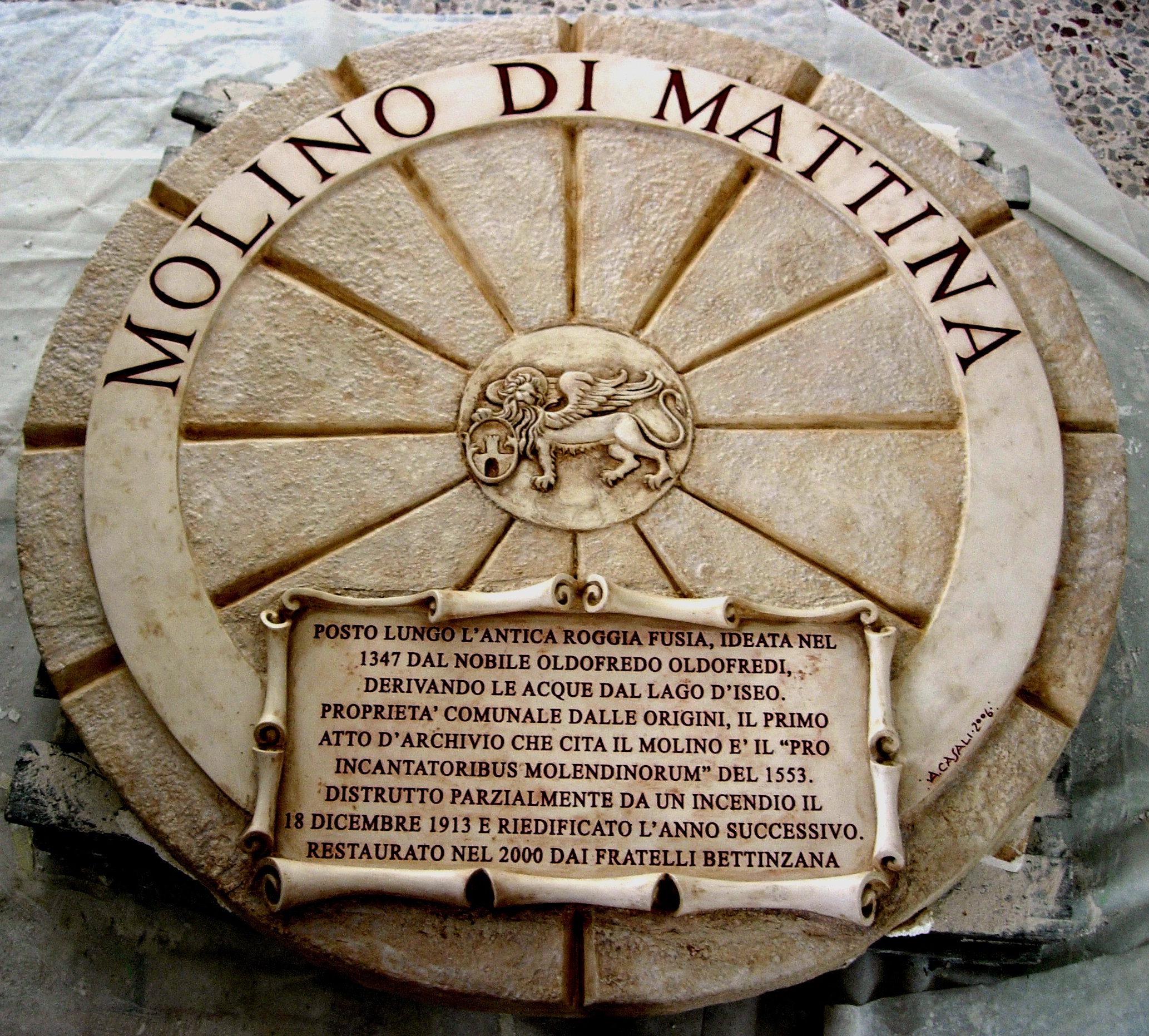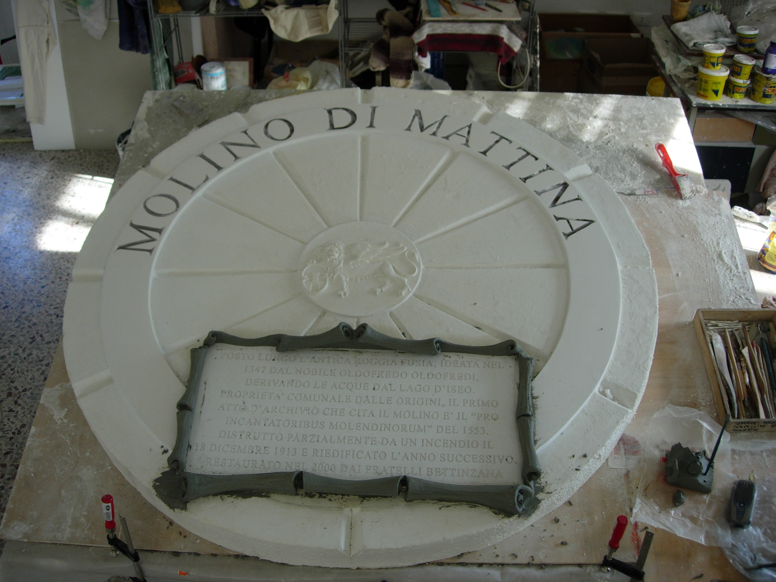 Bassorilievo commemorativo Molino di Mattina – fasi di esecuzione: dal modello in EPS, Forex , plastilina al pezzo finale in Plastoforma PL con patina effetto pietra. In collaborazione con Studio Arch. Stefano Belotti per Ristorante Stella Michelin “Due Colombe”.