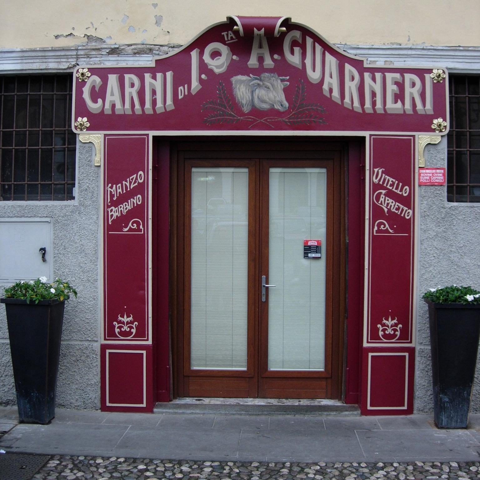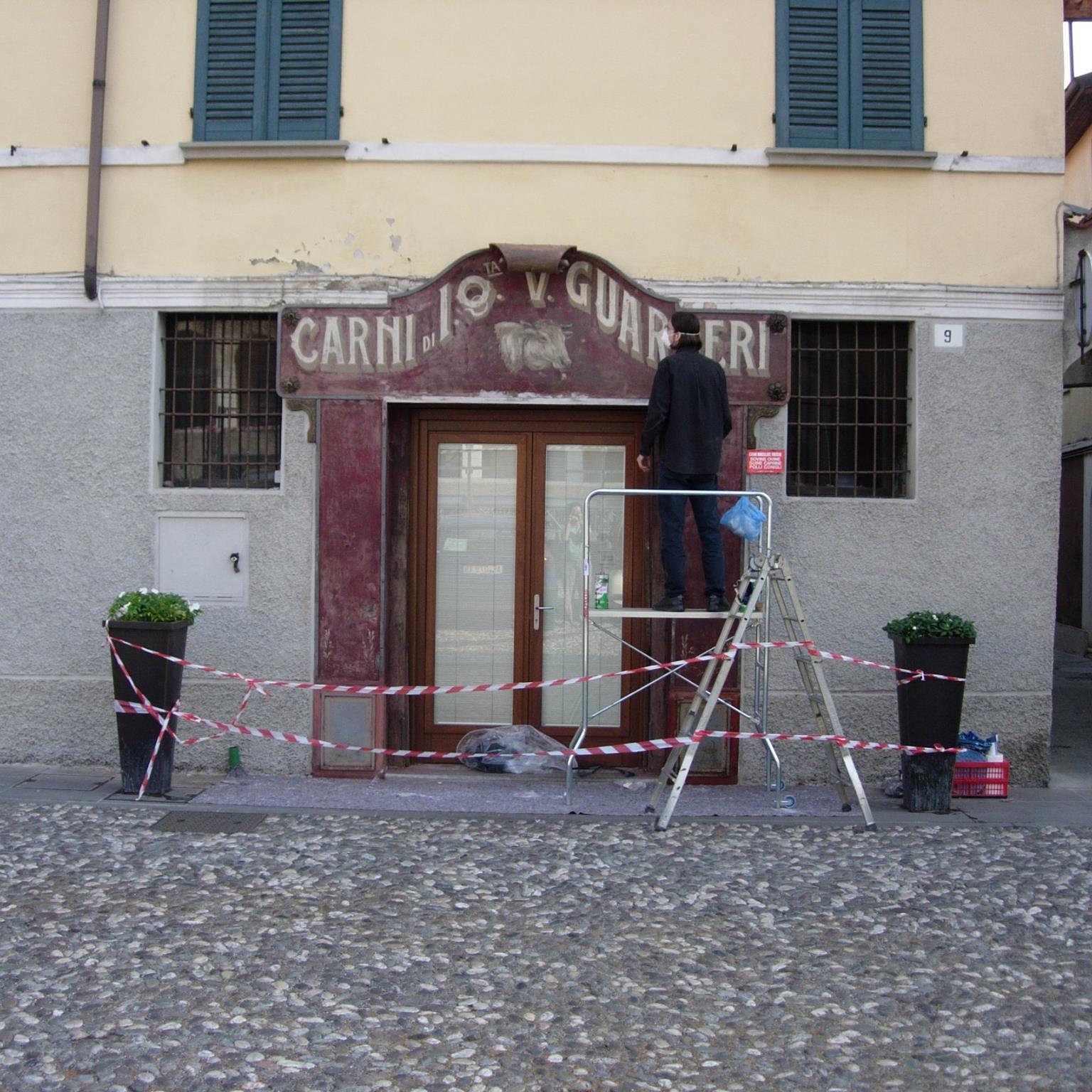 Insegna storica Bottega Guarneri 1850, Recupero pittorico – Rovato.