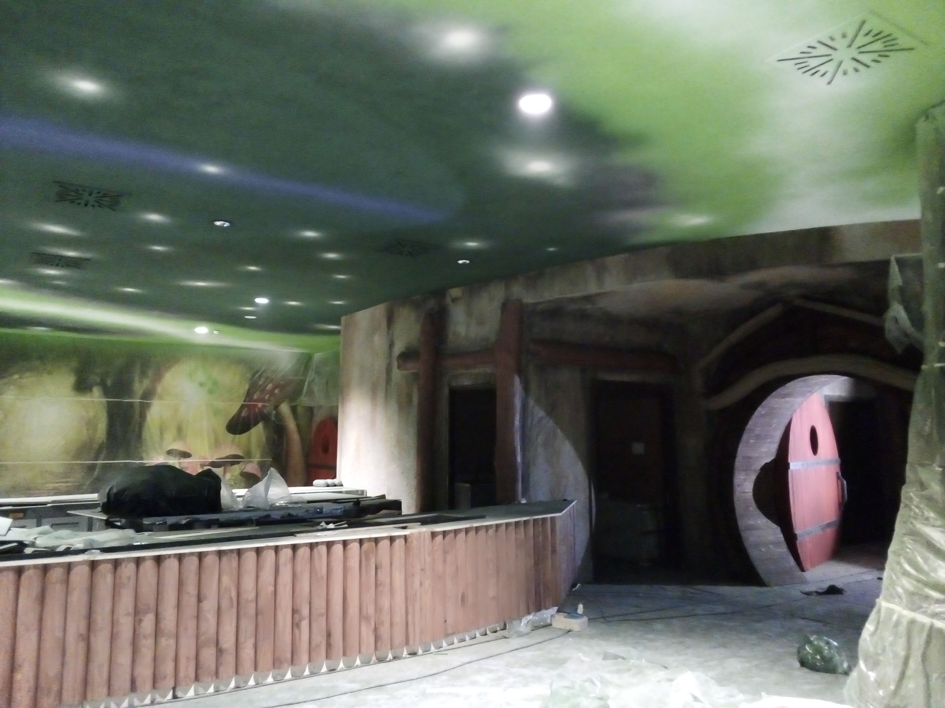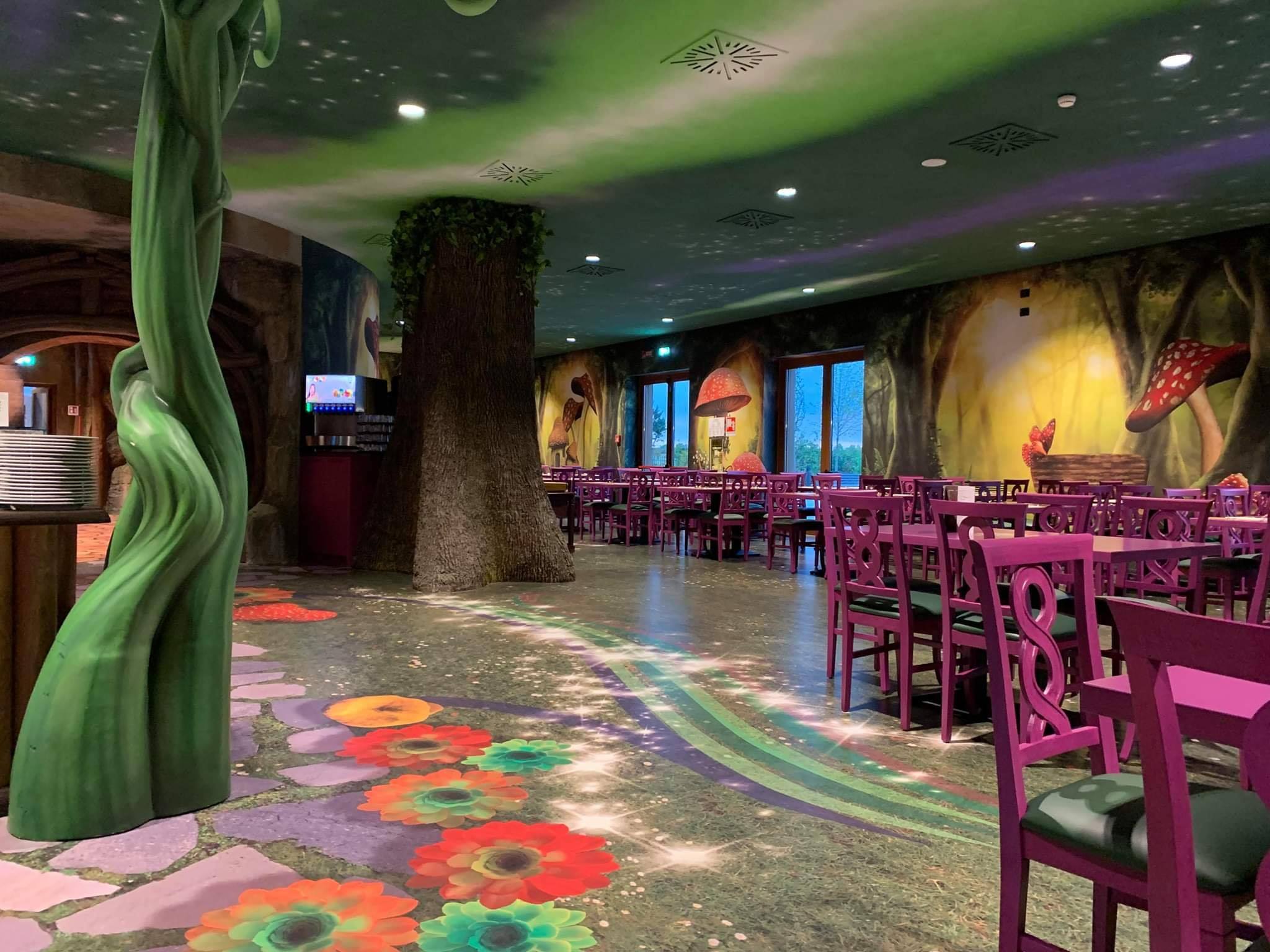 Gardaland Magic Hotel – soffitto effetto Aurora Boreale, allestimento alberi, scultura in EPS effetto legno e anticatura legni naturali. (opere eseguite per l’azienda aggiudicataria dell’appalto)