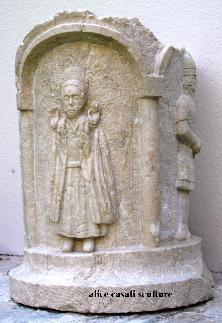 San Vigilio Parlamenta con il Capo Barbaro, Bottega Lombarda – Falso storico in Pietra di Botticino anticata e patinata.