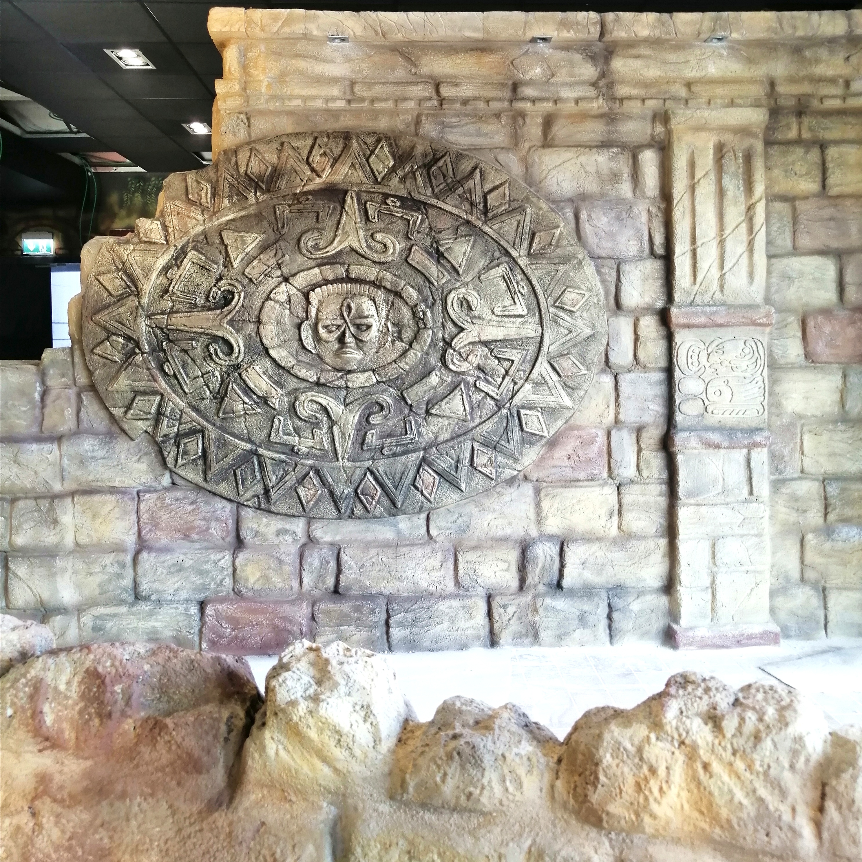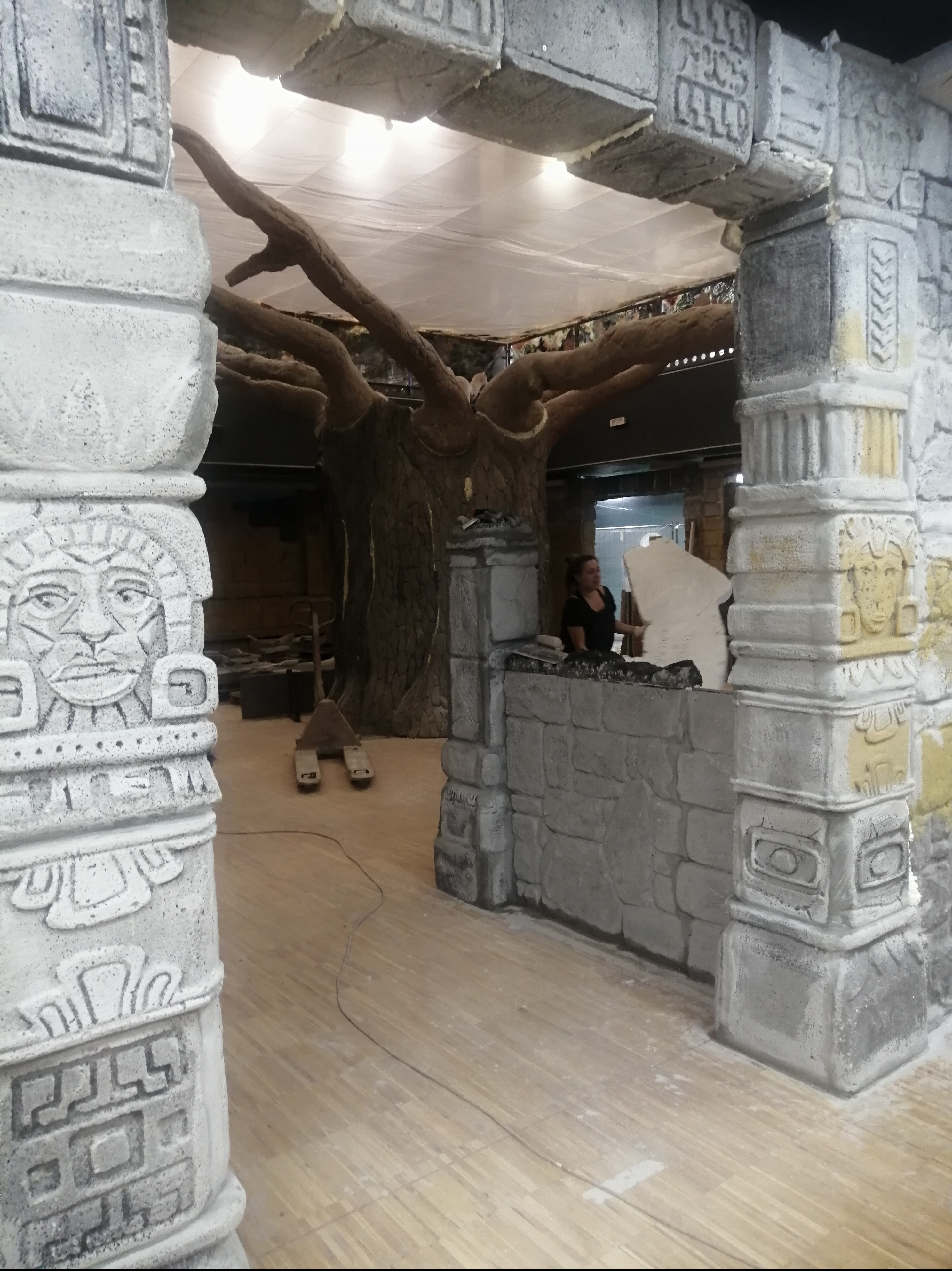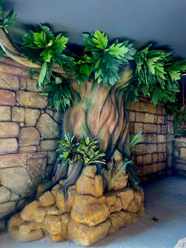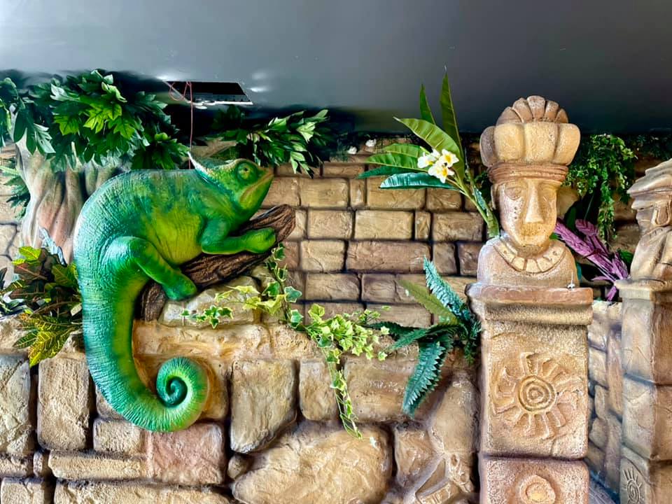 Area ristorante stile Maya – Cemento scolpito, dipinto effetto roccia anticata e corteccia, animali in VTR, fogliame sintetico. Lavori eseguiti per Fantalab e Play Mart presso Milano-Como-Varese.