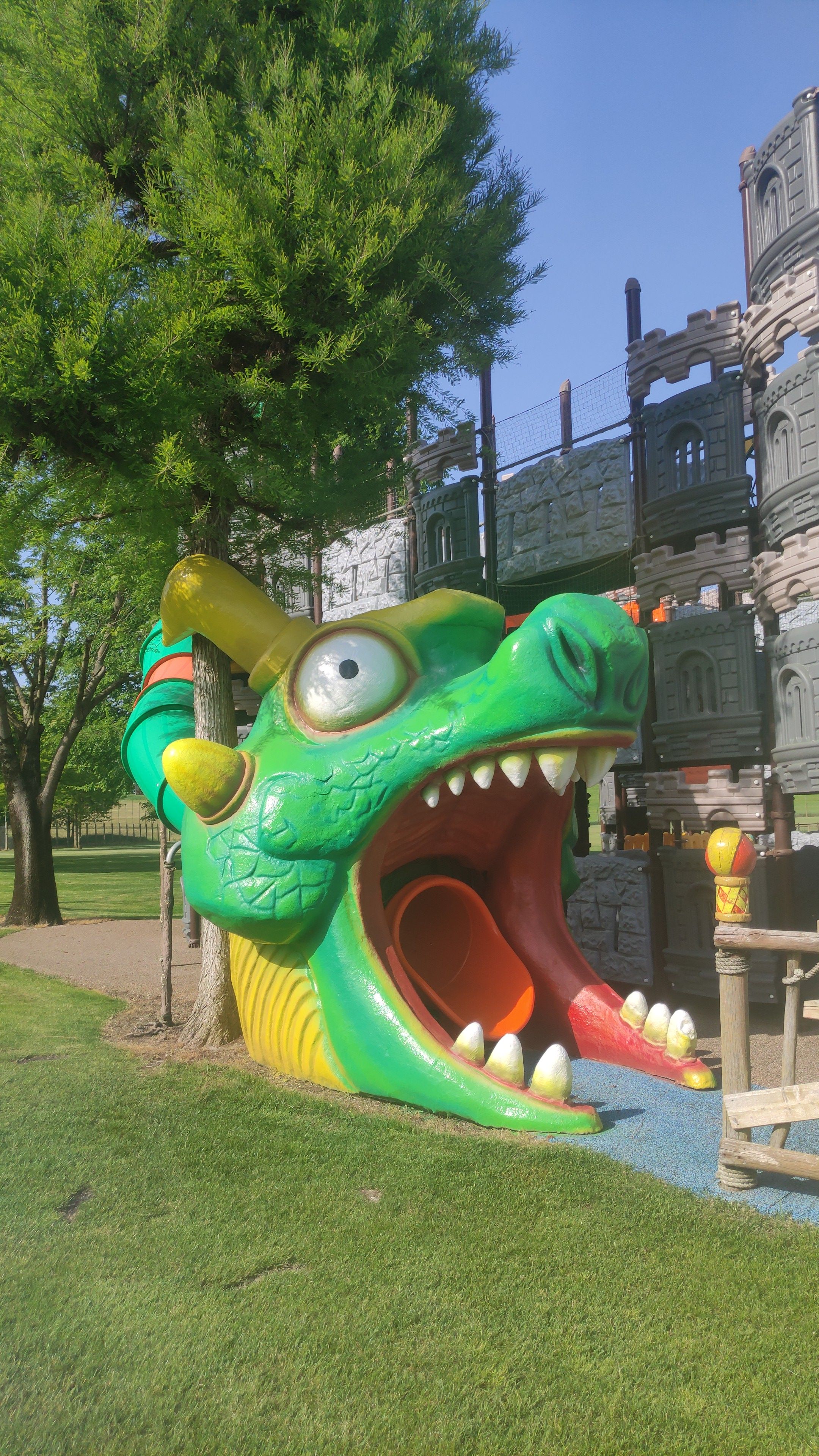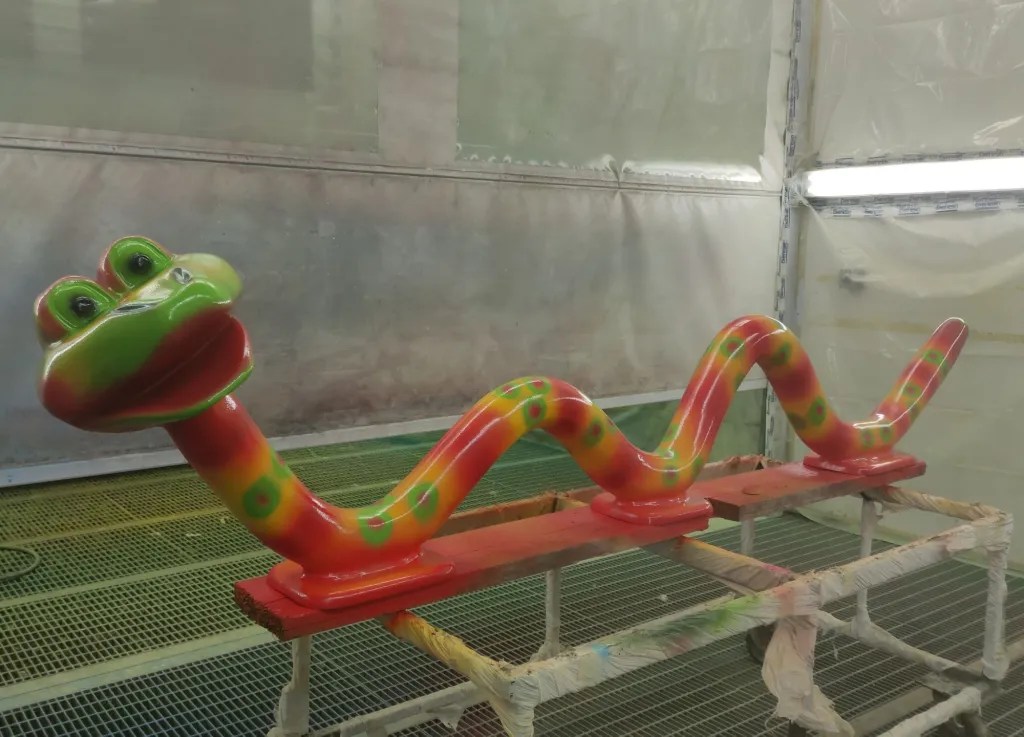 La Terra dei Draghi – Elementi vetroresina e metallo dipinti a pennello e spruzzo, finali di scivolo e decorazioni triblali Per CreativeApp Design.